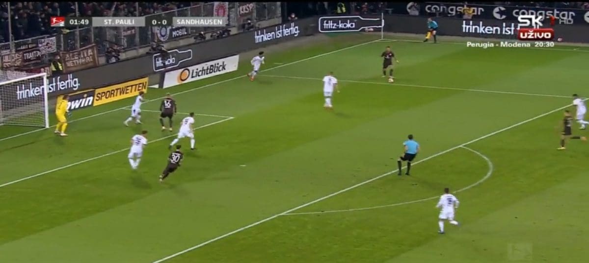 U susretu 2. Bundeslige između domaćina St. Paulija i Sandhausena, Guido Burgstaller je za domaćine zabio prekrasan gol već u drugoj minuti i to iz mrtvog kuta na asistenciju petom.