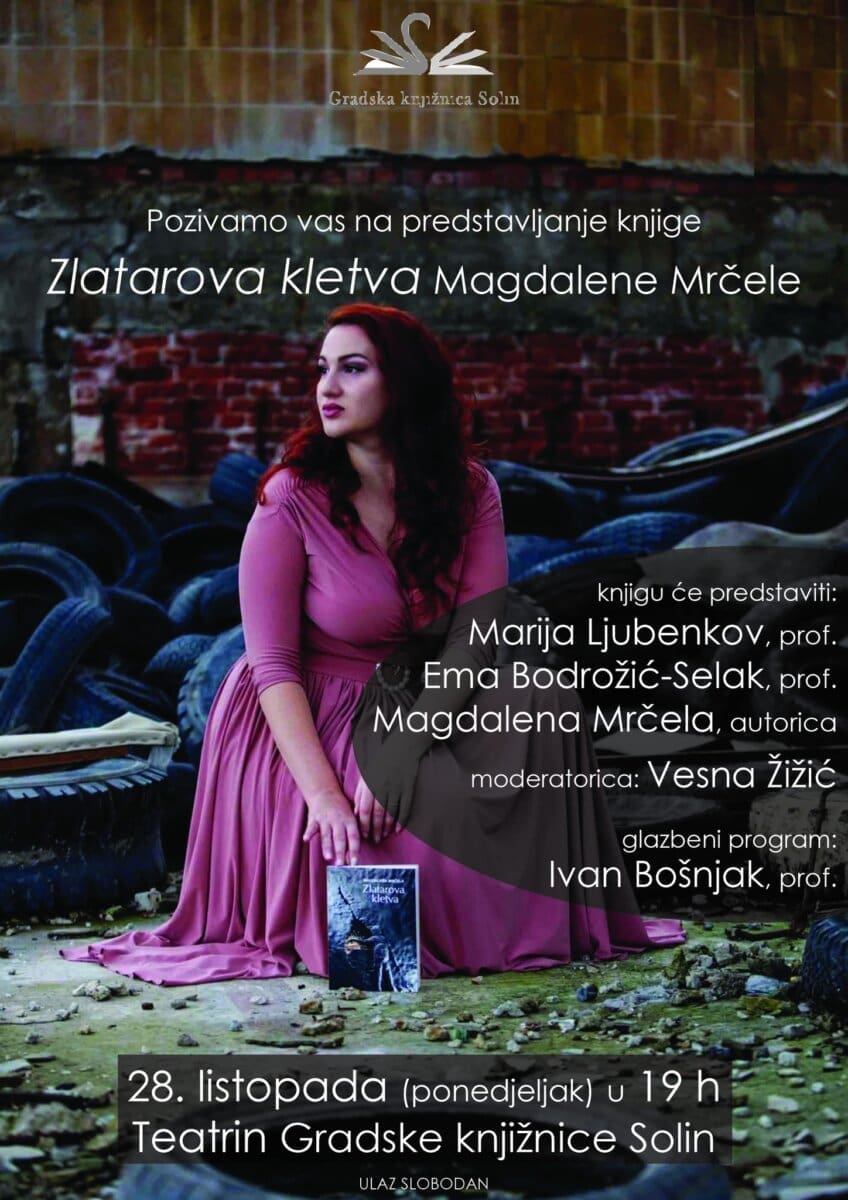 Gradska knjižnica Solin najavljuje predstavljanje knjige "Zlatarova kletva" autorice Magdalene Mrčele. Ovaj svečani kulturni događaj održat će se u ponedjeljak, 28. listopada, u 19 sati u prostoru Teatrina Gradske knjižnice Solin.