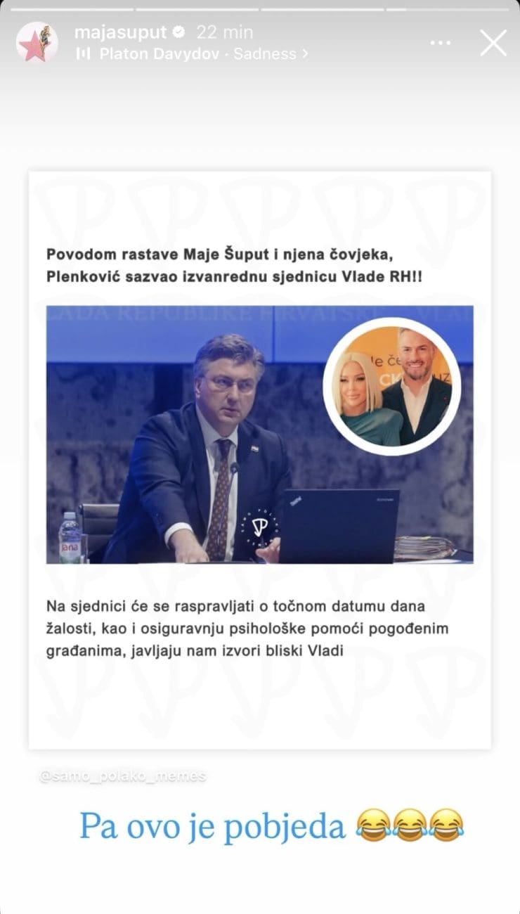 Pjevačica se sad odlučila našaliti na vlastiti račun. Naime, podijelila je objavu nalik novinskom članku na kojoj piše: 'Povodom rastave Maje Šuput i njena čovjeka, Plenković sazvao izvanrednu sjednicu Vlade RH!! Na sjednici će se raspravljati o točnom datumu dana žalosti, kao i osiguravanju psihološke pomoći pogođenim građanima, javljaju nam izvori bliski Vladi'.