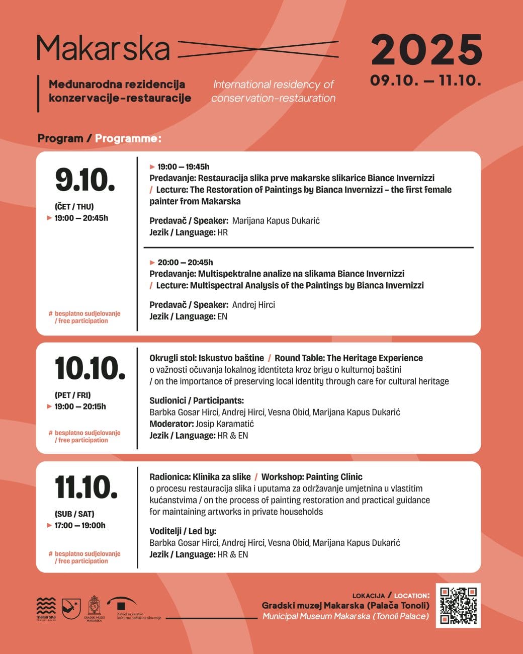 Rezidencijalni program u Gradskom muzeju Makarska započinje u četvrtak, 9. listopada, u 19 sati predavanjima – o restauraciji slika prve makarske slikarice Biance Invernizzi te o multispektralnim analizama njezinih djela. U petak, 10. listopada, u 19 sati slijedi okrugli stol „Iskustvo baštine“ na kojem će se govoriti o ulozi konzervatora-restauratora, važnosti kulturnih institucija te povezanosti turizma i očuvanja identiteta. Program završava u subotu, 11. listopada, radionicom „Klinika za slike“ (17 – 19 sati) gdje će se na primjeru djela Antuna Gojaka prikazati proces restauracije te pružiti praktični savjeti za očuvanje umjetnina u privatnim zbirkama.