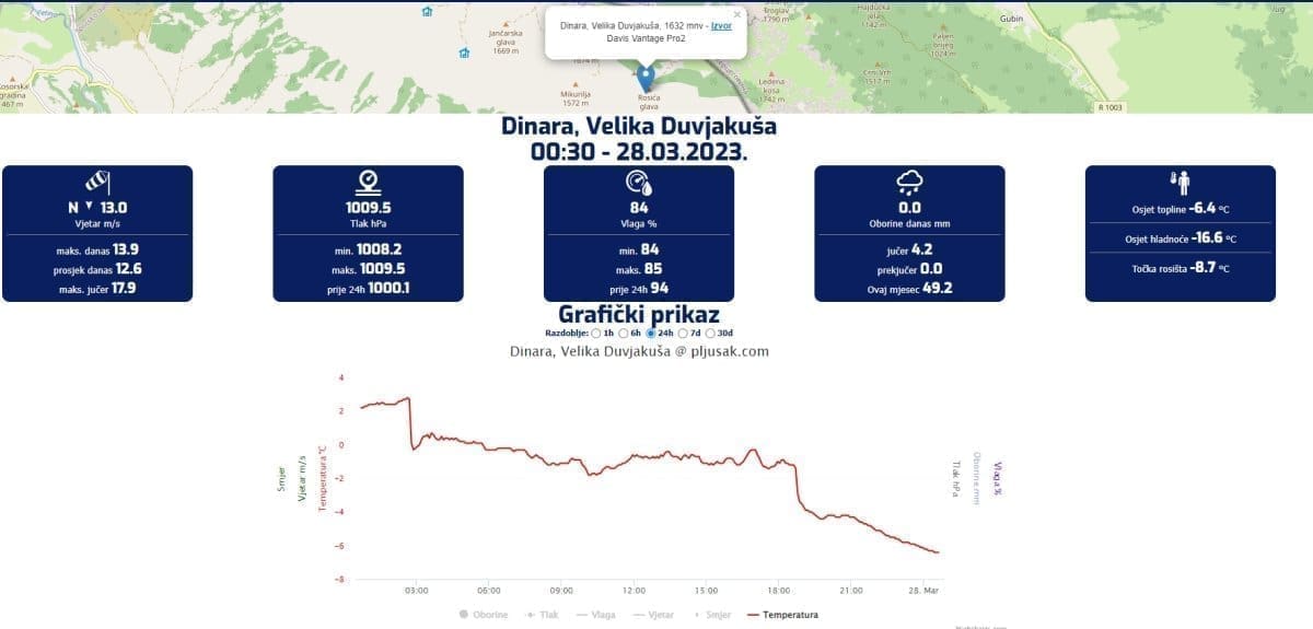 Bura je donijela pad temperature zraka koji se najviše osjeti u planinama. Najhladnije je na Sinjalu gdje je u 1 sat iza ponoći izmjereno -9°C. Velika Duvjakuša na Dinari mjeri -7°C uz osjet hladnoće do -18°C. Na Velikom Kablu na Mosoru izmjerena su -4 stupnja Celzijusa.