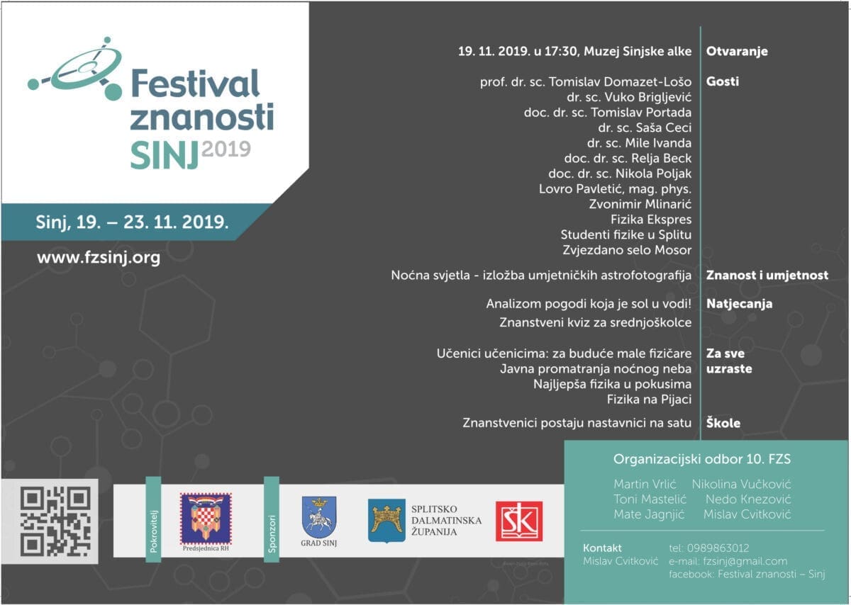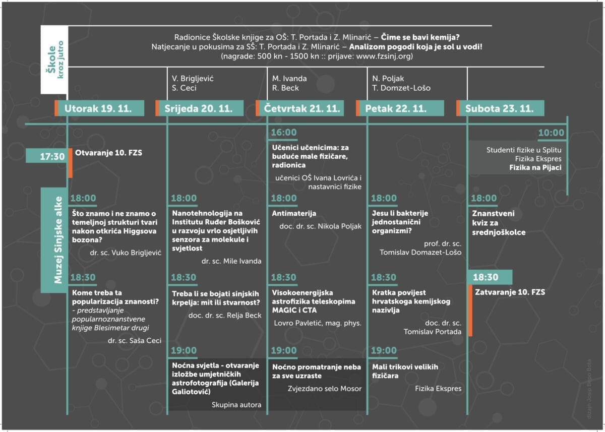 Događaj će službeno započeti u utorak 19.11. u Alkarskim dvorima u Sinju. Nakon službenog otvaranja, sadržajno će ga otvoriti vrhunski fizičar čestica, dr. sc. Vuko Brigljević, predavanjem o Higgsovu bozonu i tajnama materije koje tim otkrićem rasvjetljava današnja fizika.