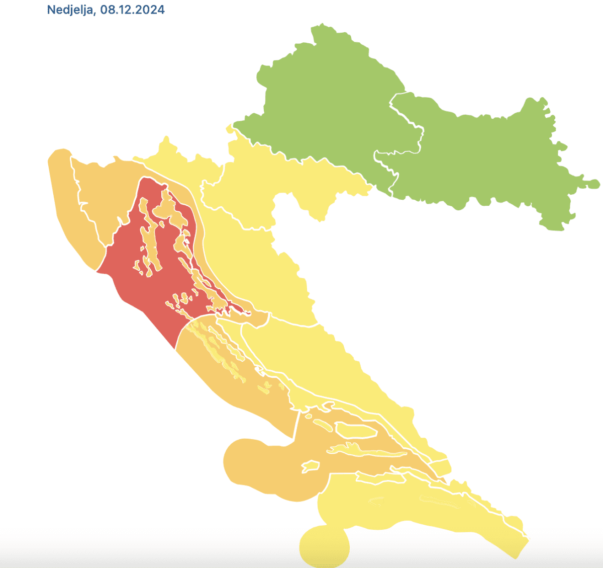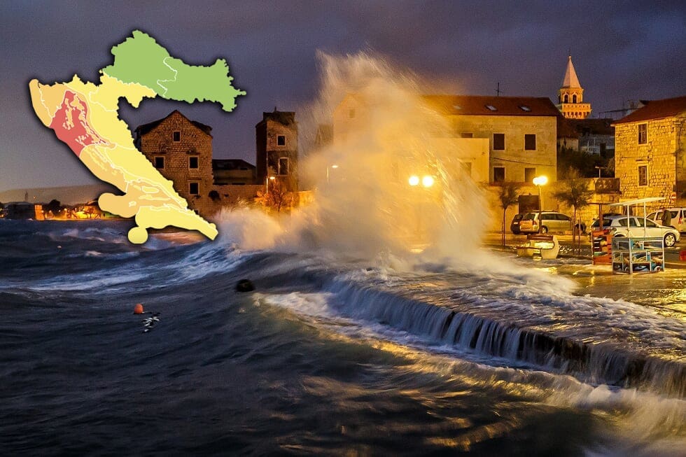 DHMZ je unutar sustava MeteoAalarm izdao narančasti stupanj upozorenja na vjetar, odnosno jugo čiji će udari dosezati 100 km/h, a za more sjevernog Jadrana izdano je crveno upozorenje zbog mogućnosti orkanskih udara vjetra u prvom dijelu dana.