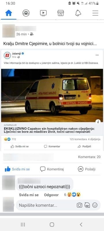 Konkretno, širi se screenshot navodne objave u kojoj piše kako je sin ravnatelja HZJZ-a Krunoslava Capaka završio u bolnici nakon cijepljenja.
