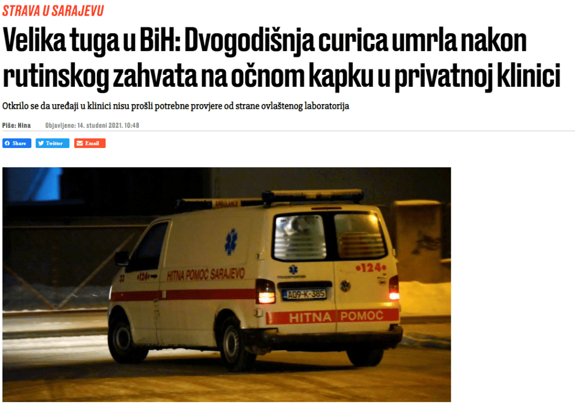 Za ilustraciju je, inače, iskorišteno vozilo Hitne pomoći iz Sarajeva, što je fotografija koju smo objavili uz tekst naslova 'Velika tuga u BiH: Dvogodišnja curica umrla nakon rutinskog zahvata na očnom kapku u privatnoj klinici'.