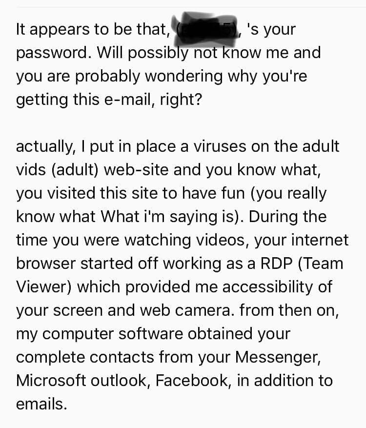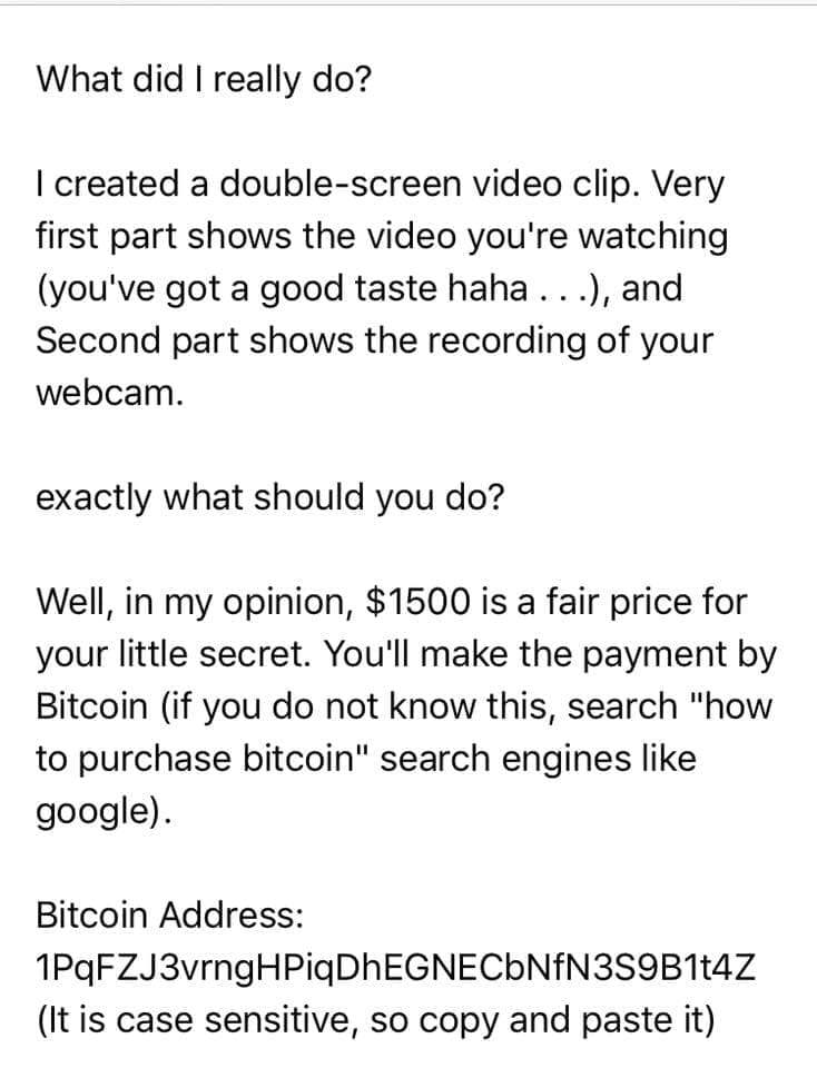 Metoda kojom napadač pokušava ostvariti financijsku dobit temelji se na objavljivanju navodnih osjetljivih podatka žrtve koja je primila ucjenjivačku poruku, ako žrtva ne izvrši uplatu u Bitcoin vrijednosti. Gotovo uvijek u tekstu poruke ucjenjivač spominje posjedovanje žrtvine kompromitirane lozinke nekog internetskog servisa. Također, navodi da posjeduje snimke s web kamere žrtvinog računala (ili mobitela) kojoj je pristupio dok je žrtva navodno pregledavala web stranice pornografskog sadržaja. Pri tome prijeti objavom navodne "ponižavajuće" video snimke svim zrtvinim kontaktima koje je prikupio s Messengera, Facebooka i e-maila. Premda se može dogoditi da poruka sadrži lozinku koju možda koristite ili ste koristili, to je vjerojatno zbog činjenice da postoje određeni servisi s bazom kompromitiranih lozinki (kao npr. već ugašeni "Leakedsource.com") s kojih je ucjenjivač preuzeo bazu kompromitiranih podataka. Ako je tako, lozinku hitno promjenite, ali nemojte nasjesti na e-mail!