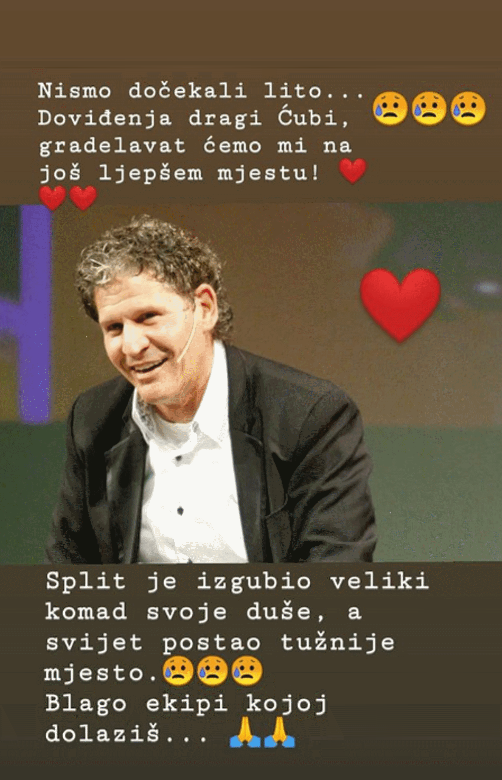 Da je pogođena njegovom smrću, Batinić je otkrila na svom Instagram profilu dan ranije. Od prijatelja i kolege oprostila se istaknuvši da je Split izgubio veliki komad svoje duše, a svijet postao tužnije mjesto. "Nismo dočekali lito... Doviđenja dragi Ćubi, gradelavat ćemo mi na još ljepšem mjestu", napisala je voditeljica.