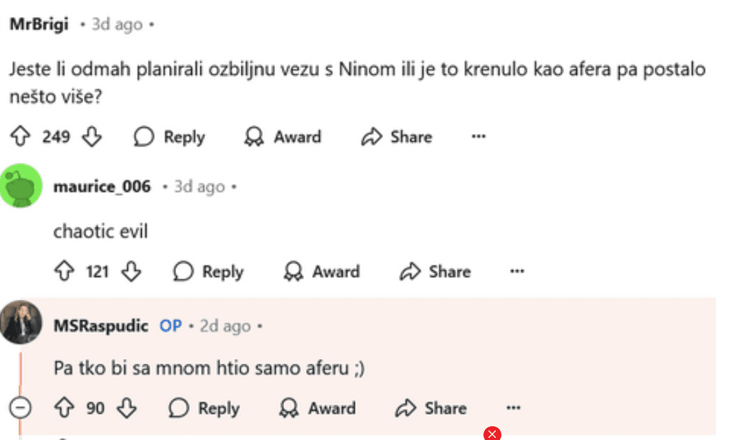 Kako je kampanja u punom jeku, Selak Raspudić nije izbjegla ni neugodna pitanja na Redditu, uključujući i ona o svojoj vezi s Raspudićem. Na jedno od njih, koje je glasilo: "Jeste li odmah planirali ozbiljnu vezu s Ninom ili je to krenulo kao afera pa postalo nešto više?", Marija je odgovorila: "Pa tko bi sa mnom htio samo aferu."