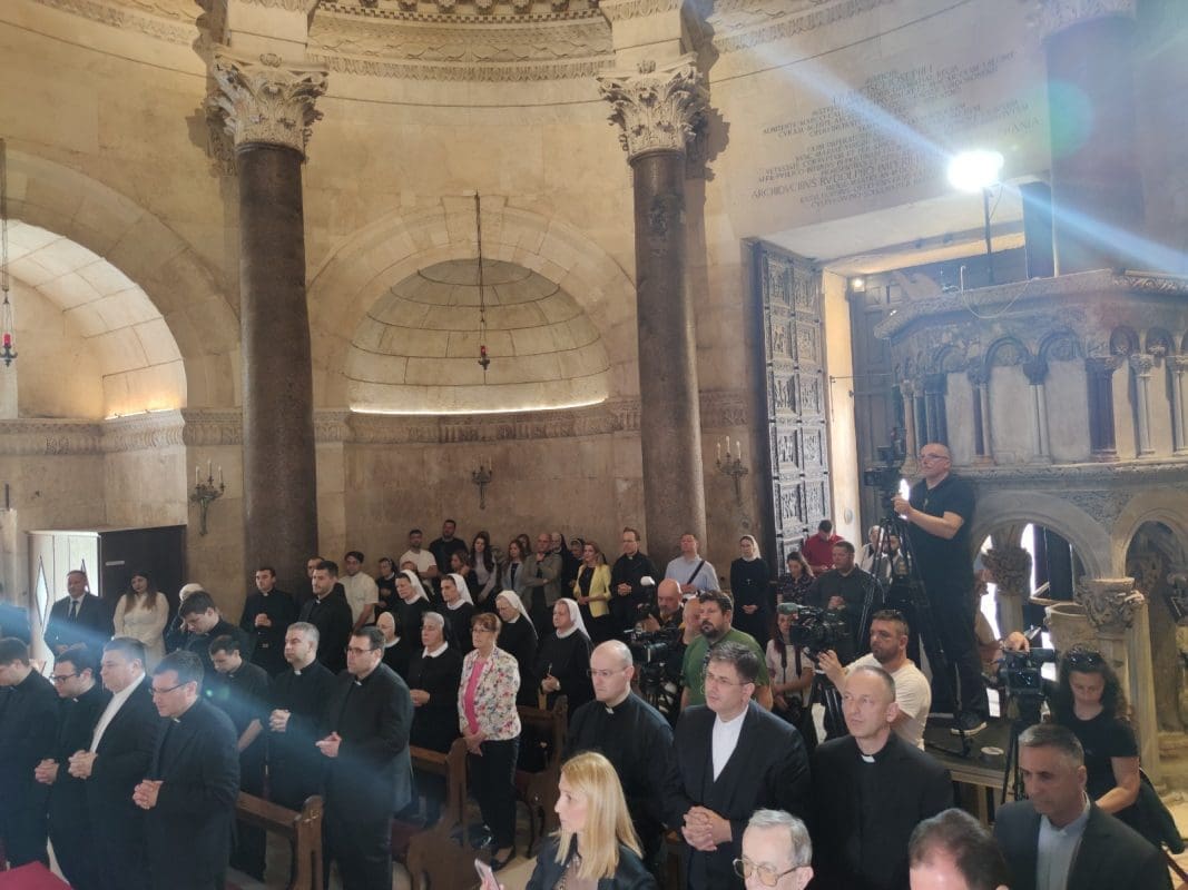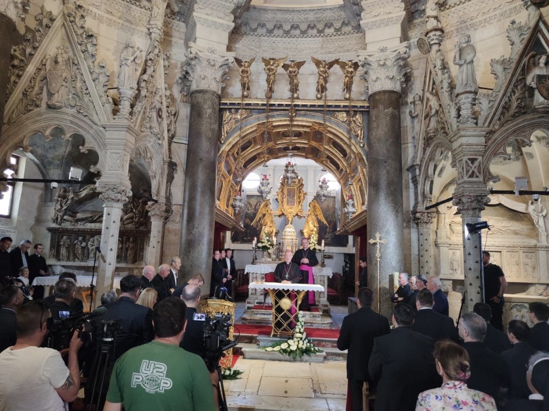 Splitsko-makarski nadbiskupi su nasljednici sv. Dujma, biskupa i mučenika, zaštitnika grada Splita i Splitsko-makarske nadbiskupije. Stoga je novi Dujmov nasljednik u pratnji nadbiskupa u miru odao počast i pomolio se pred moćima sv. Dujma, a vjernici su predvođeni đakonom otpjevali Pohvale svetom Dujmu kojega molimo da štiti našu mjesnu Crkvu s nadbiskupom našim Draženom.