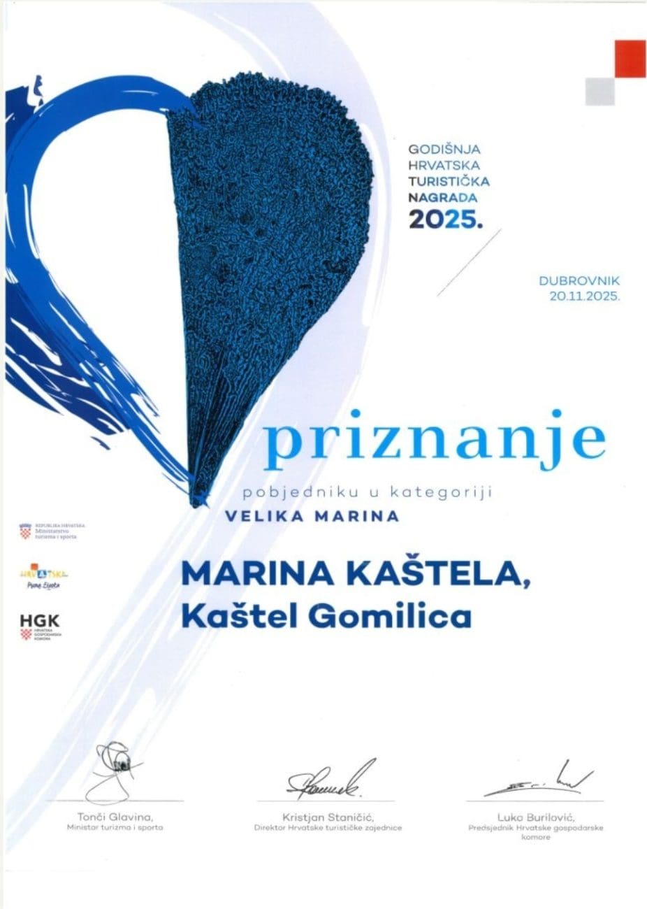 Ovogodišnje priznanje rezultat je standarda koje Marina Kaštela predano njeguje već dugi niz godina. Stručna komisija posebno je istaknula visoku razinu sigurnosti i kvalitete usluge, cjelovitu ponudu nautičkih i charter sadržaja, održivo upravljanje prostorom i brigom o okolišu te snažnu povezanost sa zajednicom. Ulaganja u sport, kulturu i dugogodišnji humanitarni rad sastavni su dio modela razvoja koji Marina Kaštela gradi više od dva desetljeća, a koji je prepoznat i nagrađen kao primjer dobre prakse u hrvatskom turizmu.