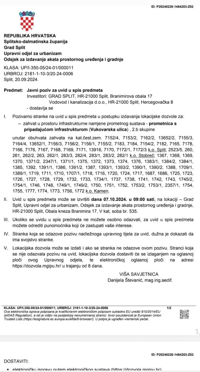 Objavila je Javni poziv za uvid u spis predmeta koji se odnosi na izdavanje lokacijske dozvole za izgradnju dijela Vukovarske ulice. Kaže da nije objavljen na stranicama Grada, kao i da ga se ne može dobiti na uvid.