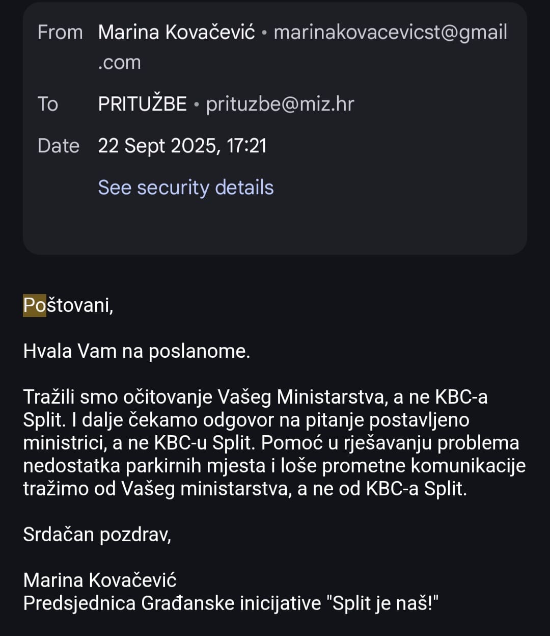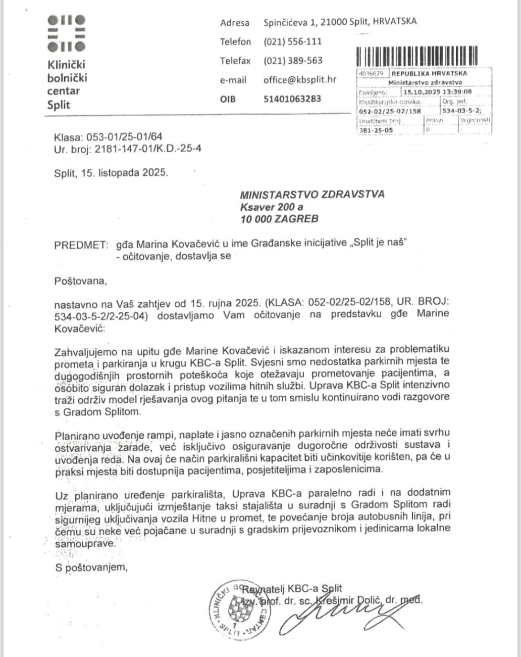 Kovačević navodi da joj je KBC Split odgovorio korektno, priznajući da su “svjesni nedostatka parkirnih mjesta”, no dodaje kako je očito da se na pomoć države više ne računa.