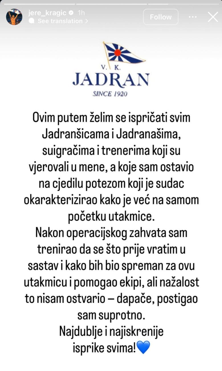 "Ovim putem želim se ispričati svim 'jadranašicama' i 'jadranašima', suigračima i trenerima koji su vjerovali u mene, a koje sam ostavio na cjedilu potezom koji je sudac okarakterizirao kako je već na samom početku utakmice.