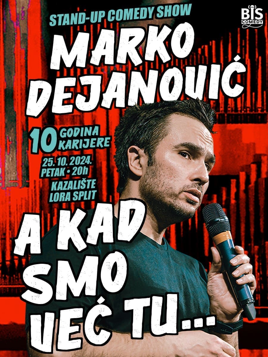 Marko Dejanović, 42-godišnji stand-up komičar, poznat po svojoj iskrenoj i duhovitoj analizi svakodnevnog života, u okviru turneje "A kad smo već tu" dolazi u Split i Zadar. U Splitu će nastupiti u petak, 25. listopada, u splitskoj Lori, dok će sljedeće večeri nastupati u HNK Zadar. Ova turneja posebno je značajna jer obilježava deset godina Dejanovićeve karijere.