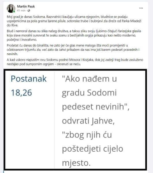 A kad uskoro napustim ovu Sodomu podno Mosora i Kozjaka, dok joj zadnji trag bude zasluženo nestajao pod sumpornim ognjem - okrenuti se neću", poručio je Pauk danas na svome Facebooku.
