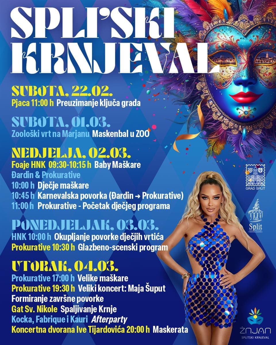 "U subotu započinje maškaradno ludilo predajom ključa ispred Stara gradska vijećnica. Očekujemo par dana potpune zabave, plesa, smijanja, kreativnih maski... Program za sve uzraste, i za djecu i za odrasle. Ove godine se svi centralni događaji premještaju na Prokurative. U zoološkom vrtu se 1. ožujka sprema program za one najmlađe, zatim nastavljamo 2. ožujka na Prokurativama Dječji karneval. Dan kasnije, 3. ožujka spremamo Karneval dječjih vrtića i ovim putem se zahvaljujem odazivu škola i vrtića koji se danima vrijedno spremaju za našu manifestaciju. Na Pogkladni utorak, 4. ožujka, su velike Maškare, šetnja s Krnjom i spektakularan koncert Maje Šuput. Spremili smo mnogo iznenađenja, i moram se ovim putem zahvaliti Gradu Splitu i Turističkoj zajednici te trvrtci Žnjan na potpori. Pokušali smo spojiti mladu energiju i starije iskustvo kako bismo iz godine u godinu revitalizirali već pomalo zaboravljene običaje", otkrila nam je voditeljica manifestacija Grada Splita, Lorena Šipić.