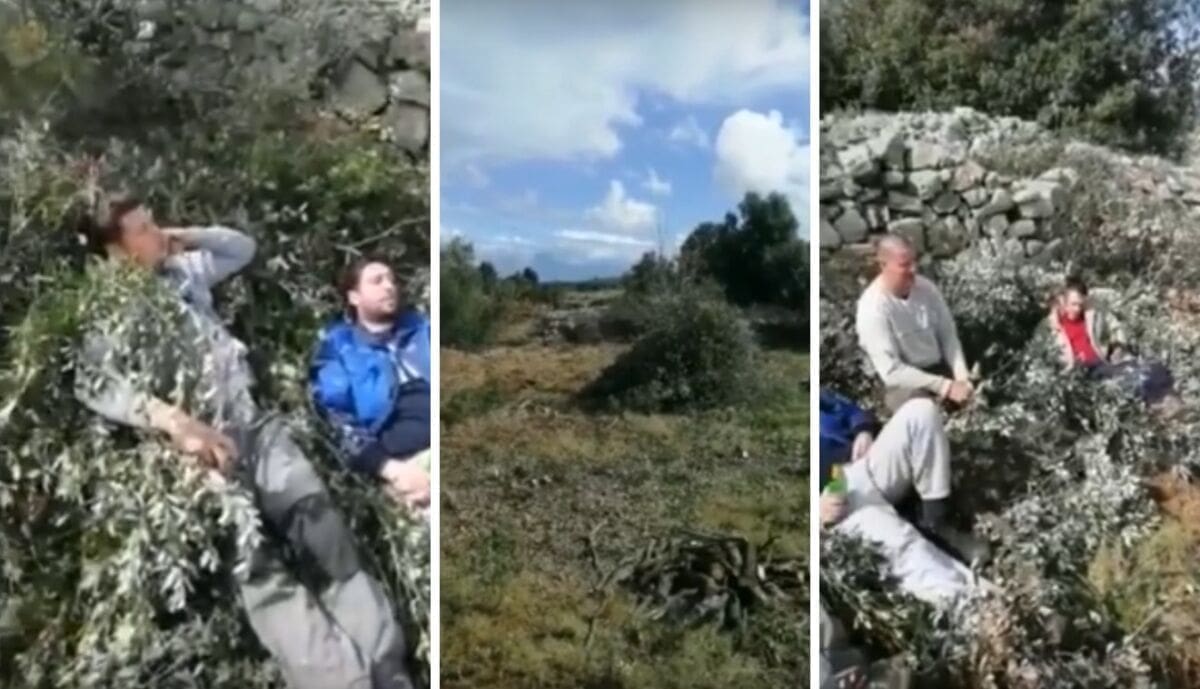 Nakon uspješno odrađenog posla zasjeli su među masline i zapjevali evergreen "Zemlja dide mog" legendarne Meri Cetinić. Pisma je potekla u višeglasju, na klapski način.