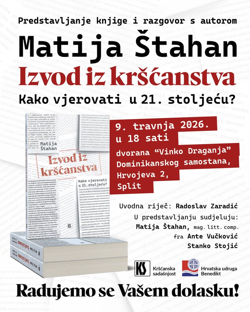 U Splitu će u četvrtak, 9. travnja 2026. godine, biti održano predstavljanje knjige "Izvod iz kršćanstva" autora Matije Štahana, uz razgovor o temi "Kako vjerovati u 21. stoljeću?". Program počinje u 18 sati u dvorani "Vinko Draganja" Dominikanskog samostana na adresi Hrvojeva 2.