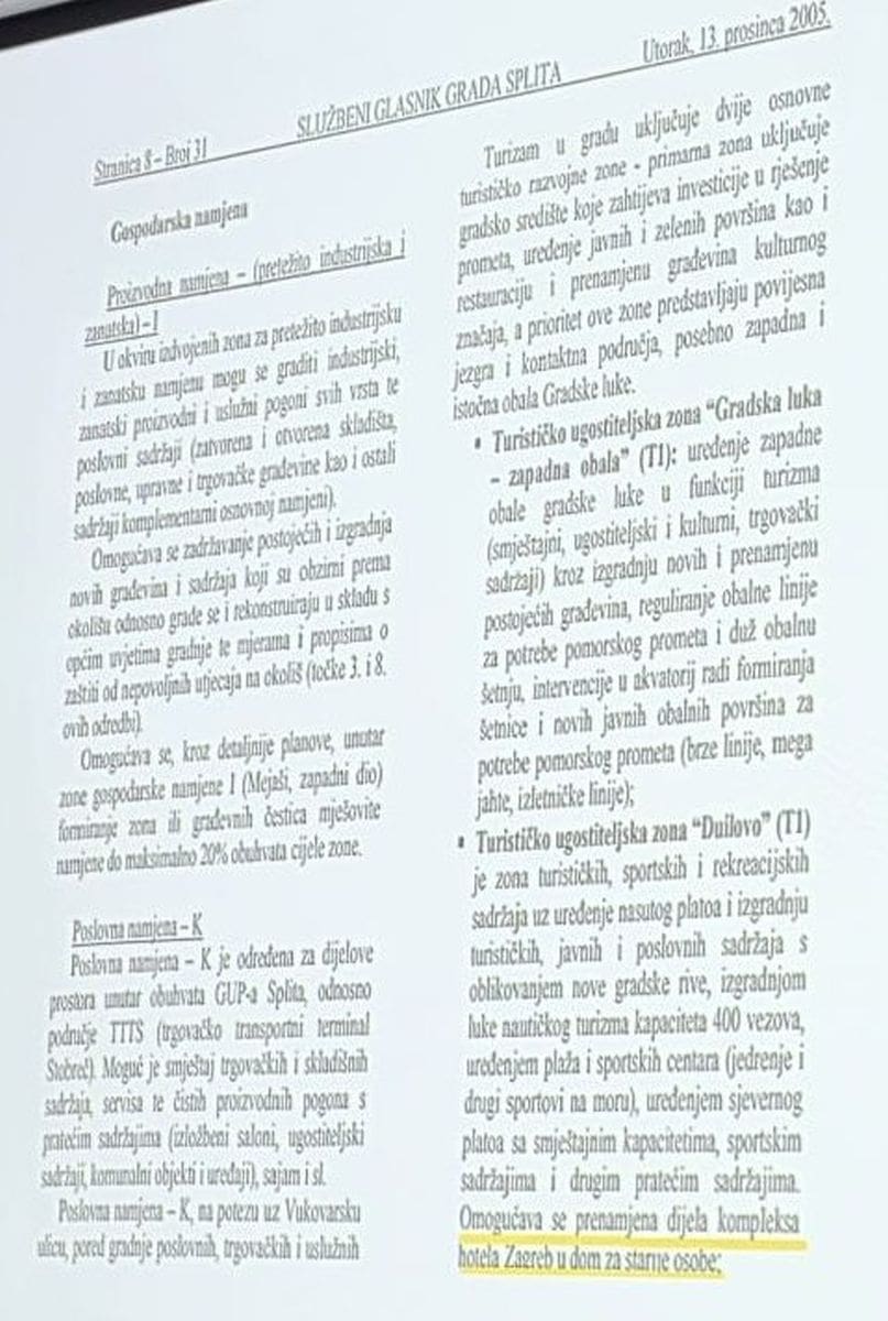 Ono što su neki previdjeli ili propustili - u prosincu 2005. godine izglasan je prostorni plan, kao i GUP i u njima već stoji formulacija da se omogućava prenamjena dijela kompleksa hotela Zagreb u dom za starije. U GUP-u stoji da se omogućava rekonstrukcija i prenamjena kompleksa hotela Zagreb uz povećanje do maksimalno deset posto. Mi već sada po važećem GUP-u iz 2005. i prostornom planu možemo prenamijeniti hotel Zagreb u dom za starije. Također piše da možemo izgraditi novu zgradu do deset posto. Hoće li tih deset posto ostat ili će se proširiti u izmjenama GUP-.a koje dolaze, o tom potom. Na temelju ovoga možemo dobiti dozvolu za rekonstrukciju, za gradnju... Hotel Zagreb ima 22.000 kvadrata, to bi značilo da ta nova zgrada može biti veća 2.200 kvadrata bruto. Ovo je vrlo važan korak, vrlo je bitno jer bez ovoga ne bi mogli ni dobiti darovnicu jer je to jedan od preduvjeta. Iz ovoga je vrlo jasno da će hotel Zagreb biti gotov puno prije onih deset godina kako mnogi procjenjuju", kaže Matijeviić.