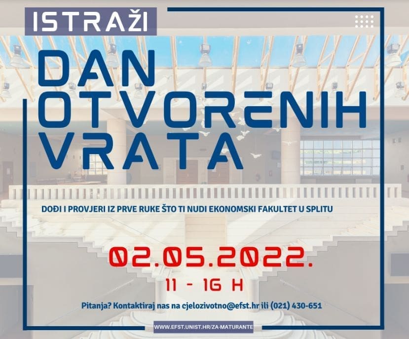 Sve detalje o Danu otvorenih vrata možete pronaći na web stranicama Ekonomskom fakulteta u Splitu ili na njihovim društvenim mrežama.