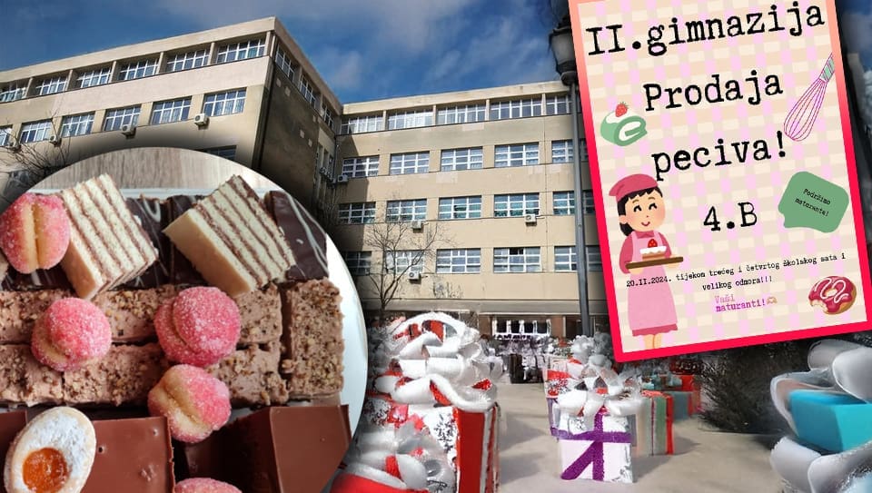 Učenici 4. B razreda II. gimnazije organiziraju prodaju peciva i kolača kako bi prikupili sredstva za svoju maturalnu zabavu. Prodaja će se održati 20. veljače 2024. (danas, srijeda) tijekom trećeg i četvrtog školskog sata te za vrijeme velikog odmora, u atriju škole.