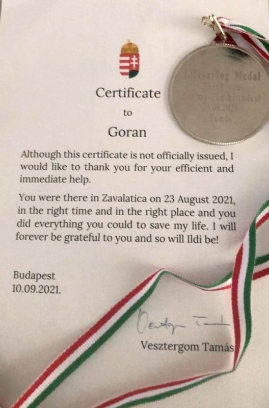 Na medalji je simbolično ugravirano "hvala ti za moj drugi rođendan 23.08.2021. godine". Upravo je tog datuma Goran spasio Mađara, a detalje je za Morski.hr otkrio njegov šurjak, Julije Urban.