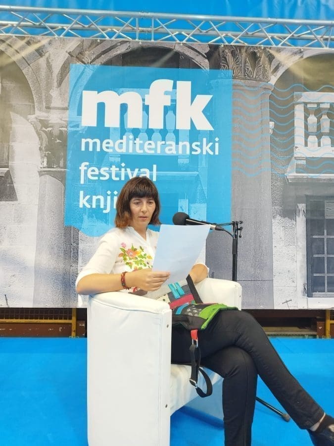 Na susretu je pročitala i svoju najdražu priču iz zbirke "Bapske priče" pod naslovom "Splitska banka", također objavljenu i na Facebooku (https://www.facebook.com/1426620784331023/posts/1426634920996276/).