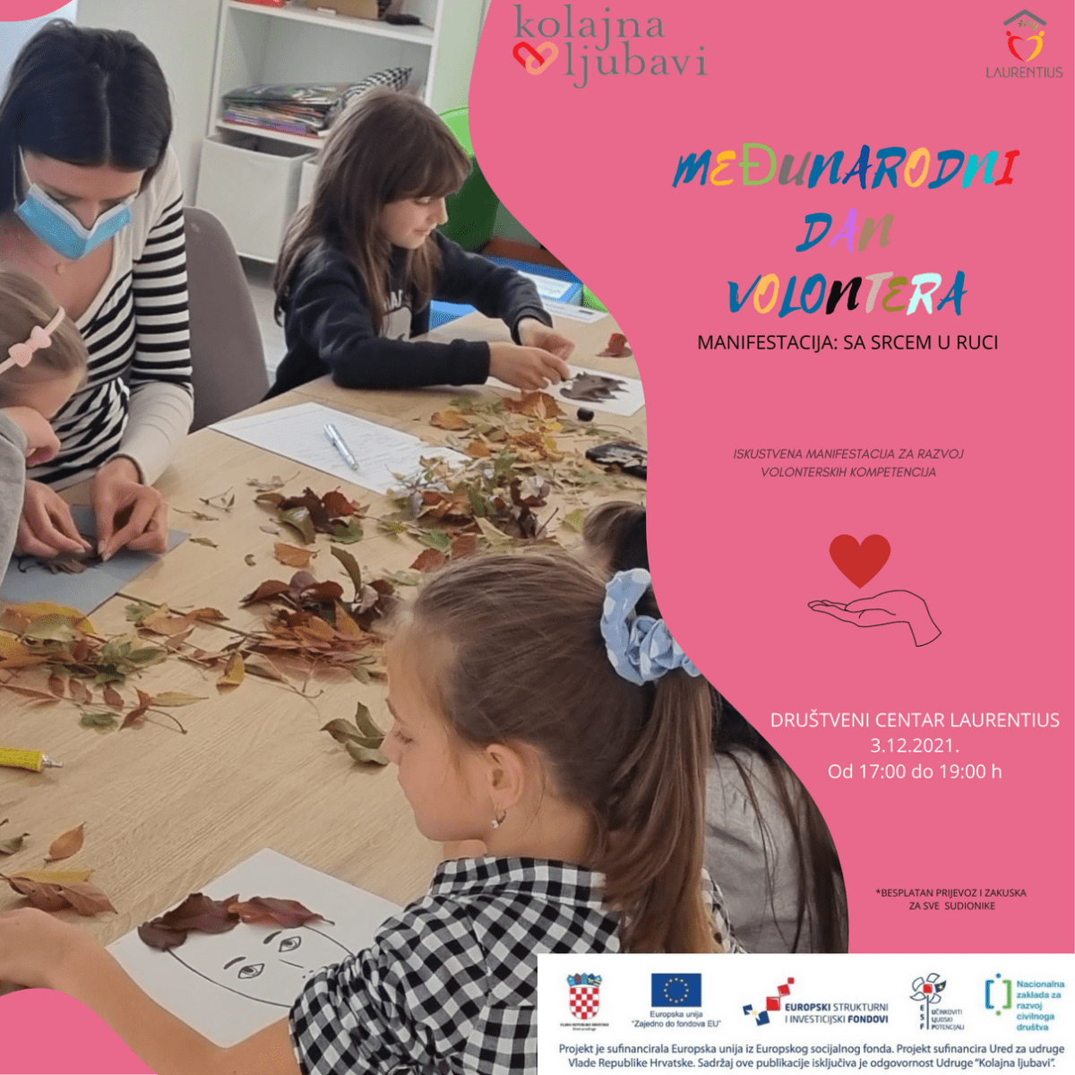 Udruga “Kolajna ljubavi“ 3. 12. 2021 u 17h organizira manfestaciju „Sa srcem u ruci“ na adresi Društvenog centra Laurientius, Dr. Franje Tuđmana 6 u Lovreću sa svrhom promoviranja volonterstva i angažiranog građanstva povodom Međunarodnog dana volontera.