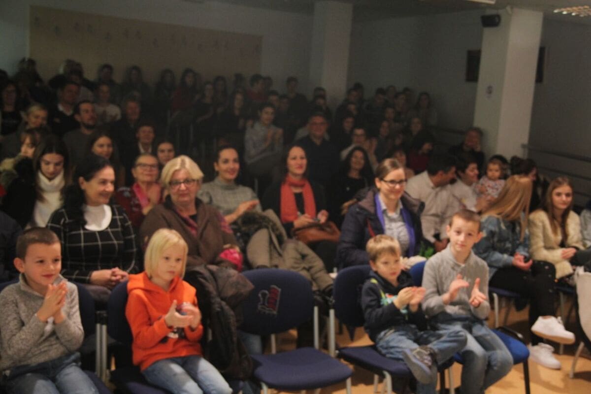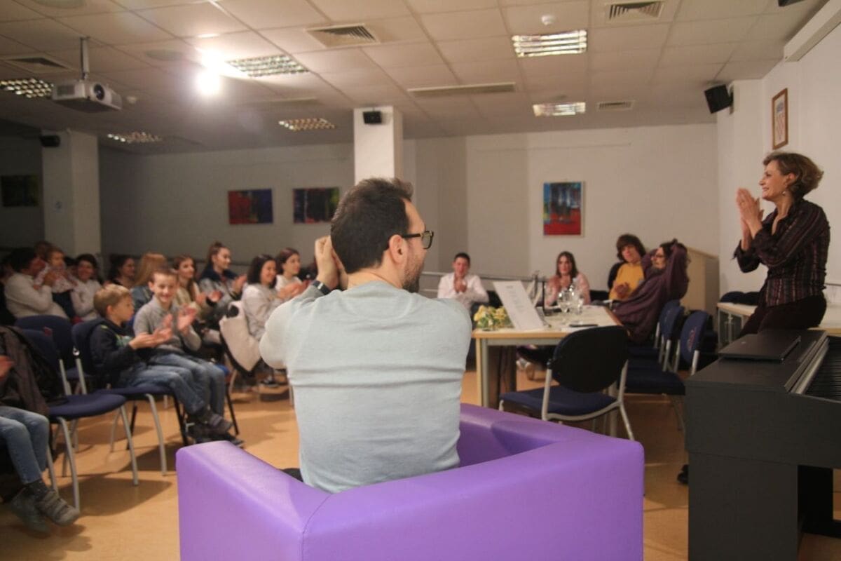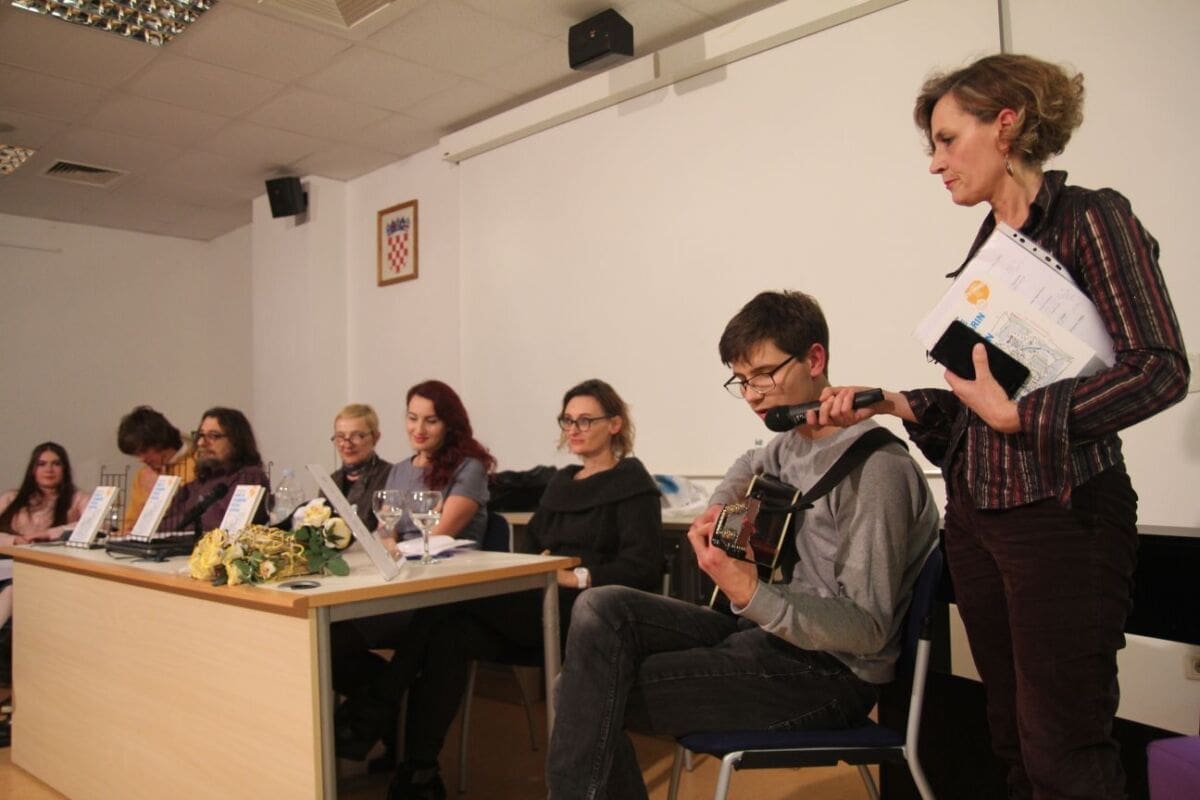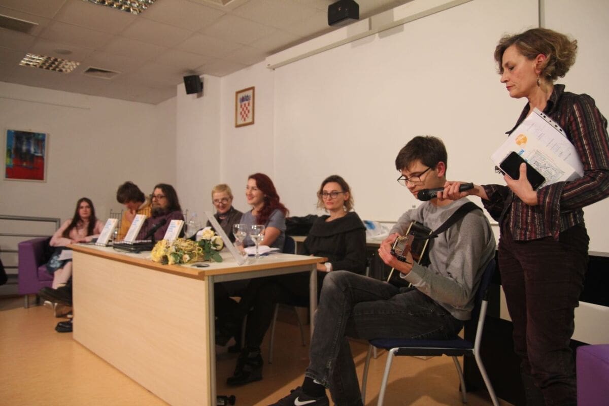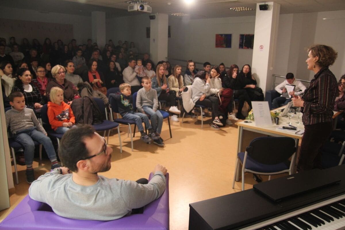 Teško da je ikad dvorana GKMM-a bila ispunjenija nego na ovoj promociji. Naime, mi koji smo malo kasnili jedva smo našli mjesto za sjesti, a bilo je onih koji su pratili predstavljanje ove izvrsne knjige s nogu. Promocija, pomalo drugačija od uobičajene, započela je s nekoliko uvodnih riječi moderatorice Grozdane Ribičić, voditeljice dječjeg odjela GKMM-a, i najave glazbenih izvedbi na gitari i klaviru od strane Magdaleninog učenika Bruna Jakobljevića i kolege profesora glazbene kulture Ivana Bošnjaka. Ulaskom Magdalene u dvoranu prolomio se ogroman pljesak kolega novinara, profesora, obitelji, prijatelja i razreda kojima predaje, a tu su od školaraca bili učenici razreda 1. D, 2. D, 2. F i 3. A.