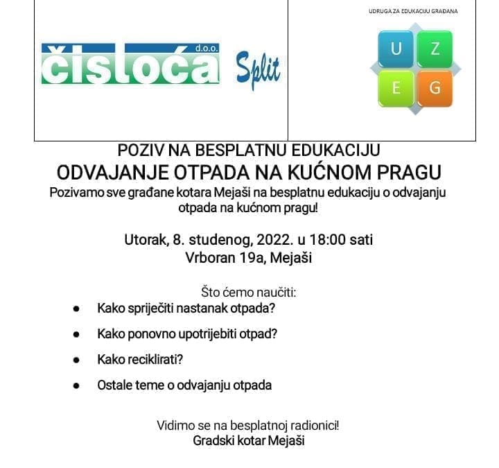 8. studenoga (utorak) u 18 sati, u prostorijama Gradskog kotara Mejaši, na adresi Vrboran 19a (pored ljekarne na Kili) održat će se edukacija na temu odvajanja otpada na kućnom pragu.