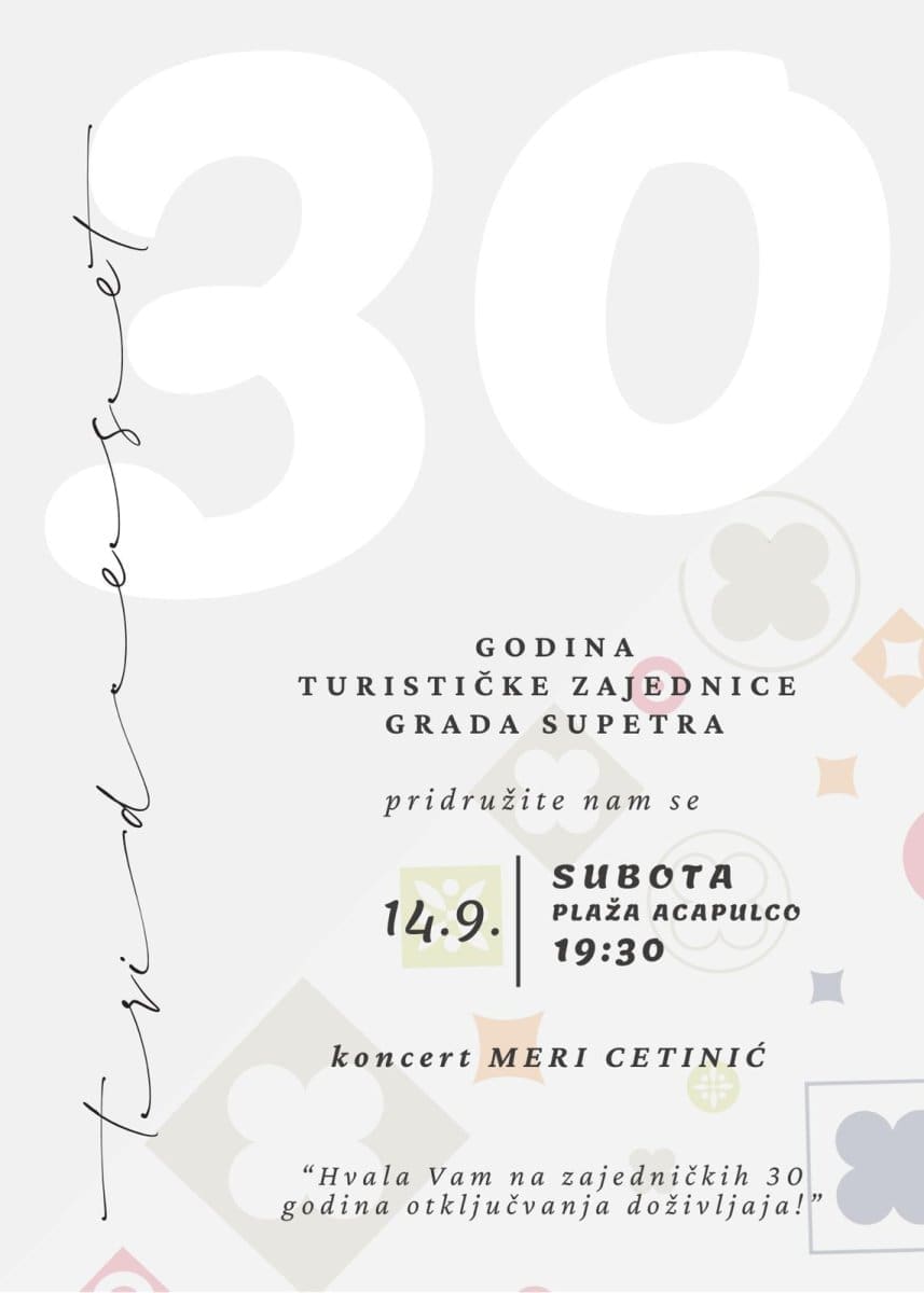 U subotu, 14. rujna 2024., s početkom u 19:30, na plaži Acapulco u Supetru održat će se poseban koncert povodom obilježavanja 30 godina djelovanja Turističke zajednice grada Supetra. Na ovom glazbenom spektaklu nastupit će legendarna hrvatska pjevačica Meri Cetinić, koja će svojim hitovima i prepoznatljivim glasom razveseliti publiku svih generacija.