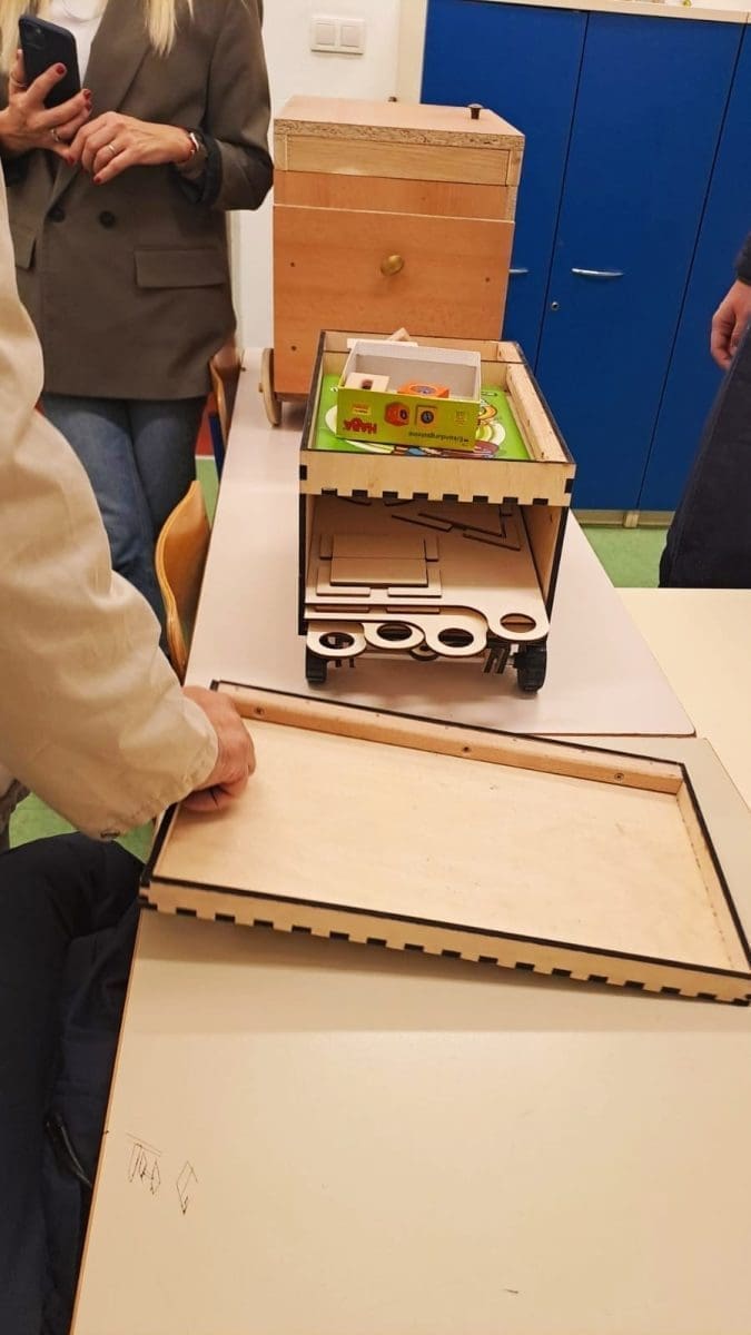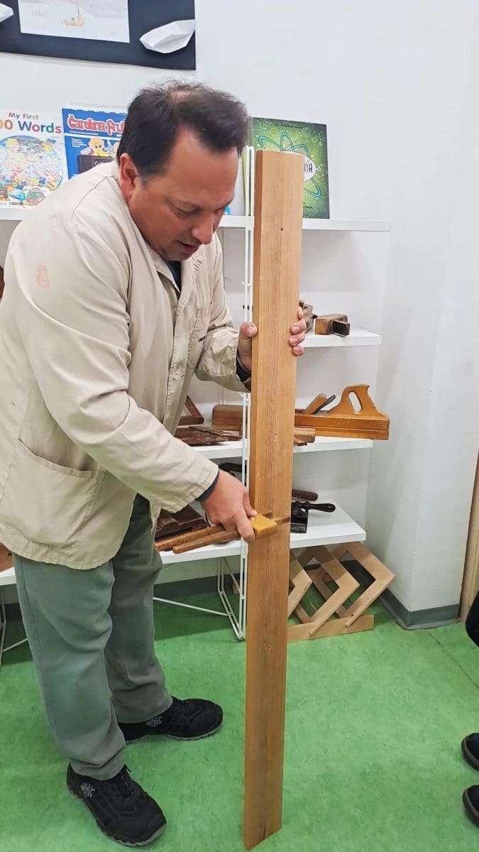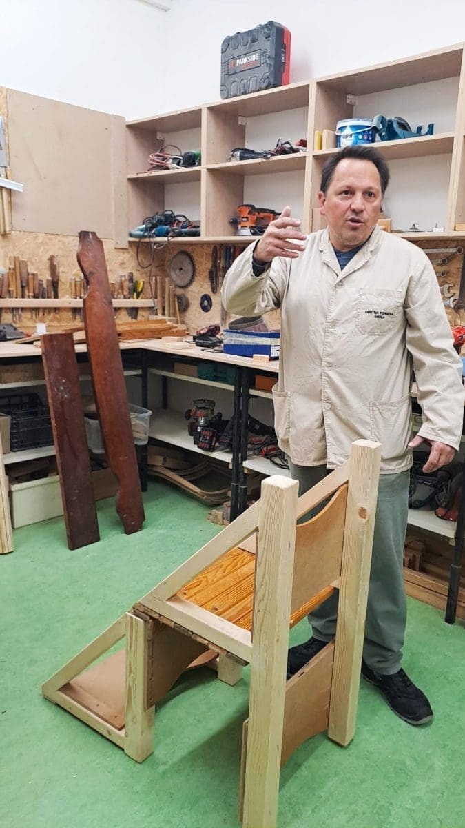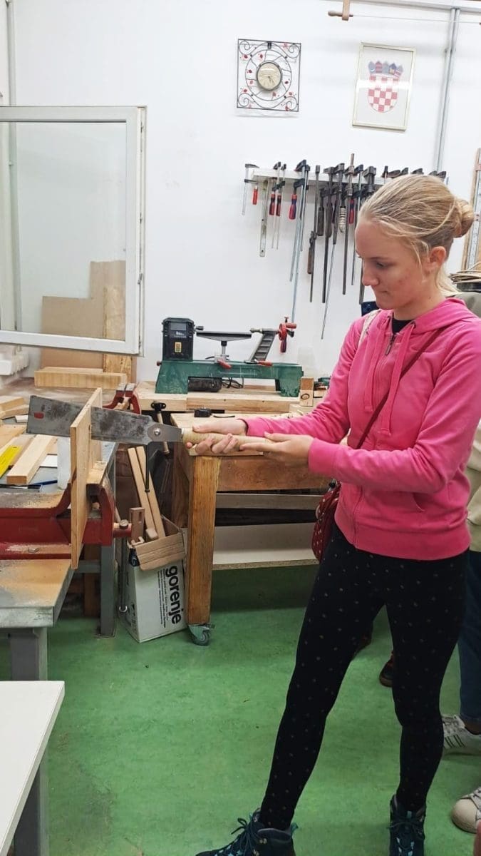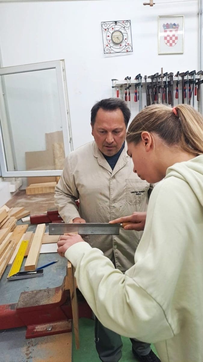 Profesor je upoznao učenike osnovne škole s ručnim alatima za obradu drva te prezentirao izrađeni proizvod (stolicu) koji su učenici Obrtno tehničke škole izradili od recikliranog drva. Pokazao je učenicima i druge radove izrađene od drva, a oni su za vježbu imali ručno pilanje drva, te su se upoznali s obradom drva i ostalim zanimljivostima i aktivnostima ove srednje škole.