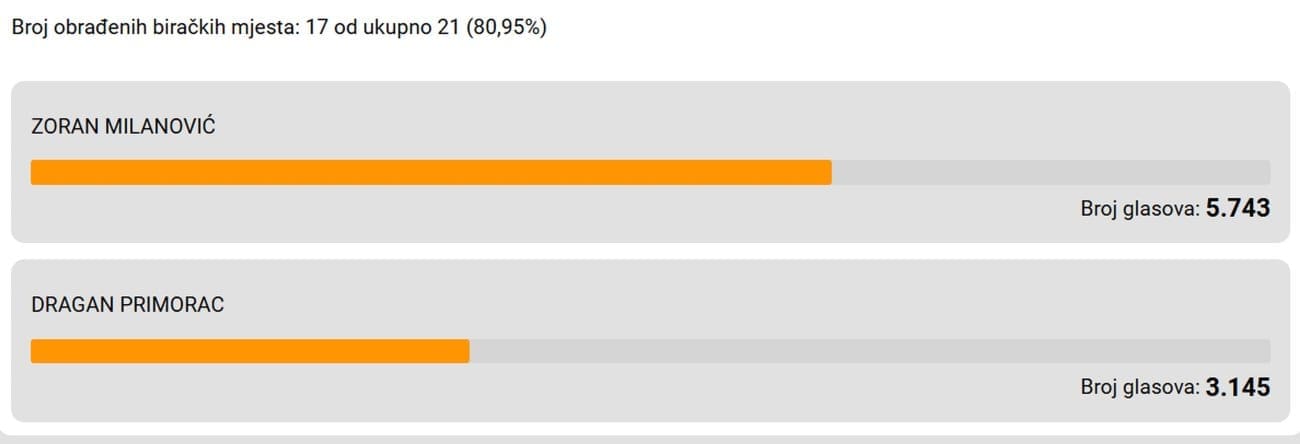 Čini se da će Zoran Milanović uvjerljivo pobijediti u drugom krugu predsjedničkih izbora i u Kaštelima, tradicionalnoj utvrdi HDZ-a. Naime, nakon više od 80% obrađenih biračkih mjesta, Milanović ima 5.743 glasa, dok je Primorac na 3.145 glasova.