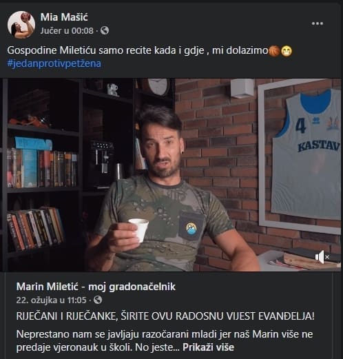 Mia Mašić, košarkaška reprezentativka Hrvatske, pozvala je Marina Miletića, kandidata Mosta za gradonačelnika Rijeke, na košarkašku utakmicu kao odgovor na njegove izjave o muškarcima i ženama.
