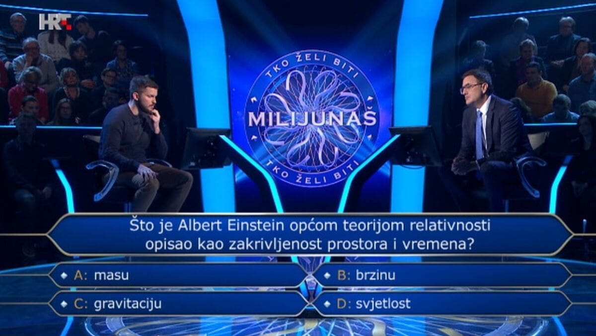 Marko je upotrijebio prvoga džokera, "pola-pola", na pitanju za 16.000 kuna. Nije znao je li Albert Einstein općom teorijom relativnosti kao zakrivljenost prostora i vremena opisao masu, brzinu, gravitaciju ili svjetlost. Džokerom sužen izbor na masu i gravitaciju i dalje ga je ostavio u nedoumici te se odlučio na poziv, i to džokeru koji mu je izričito rekao da ga ne zove za pitanja vezana iz područja znanosti. No čuvši na čemu je natjecatelj zapeo, džoker je ipak znao kako je riječ o gravitaciji i Marku pomogao domoći se 16.000 kuna.