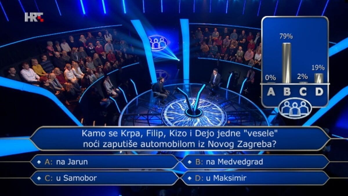Kamo se Krpa, Filip, Kizo i Dejo jedne "vesele" noći zaputiše automobilom iz Novog Zagreba? Na Jarun, Medvedgrad, u Samobor ili u Maksimir? Glasilo je pitanje za prelazak drugoga praga. Znao je da se pitanje odnosi na likove iz filmskoga ostvarenja "Metastaze" koji su se zaputili na Oltar domovine, no gdje se Oltar nalazi, morao je pitati publiku. Ona je sa 79 posto glasova odgovorila - Medvedgrad, a povjerenjem koje joj je Marko dao, osvojio je 32.000 kuna te stekao mogućnost otvaranja sljedećeg pitanja.