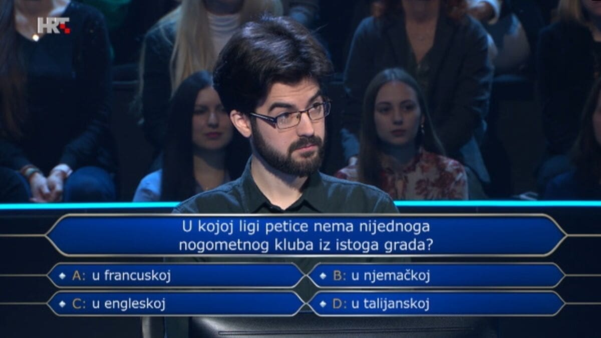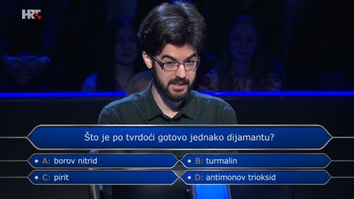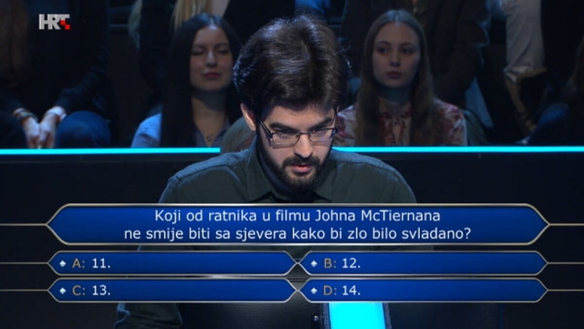 Mladi predavač u Tehničkoj gimnaziji te ljubitelj pub-kvizova s lakoćom je prešao prvi prag. Na pitanju za 4000 kuna malo je "zapeo" ne znajući koji od ratnika u filmu Johna McTiernana ne smije biti sa sjevera, kako bi zlo bilo svladano. Je li riječ o 11., 12., 13. ili 14. ratniku?