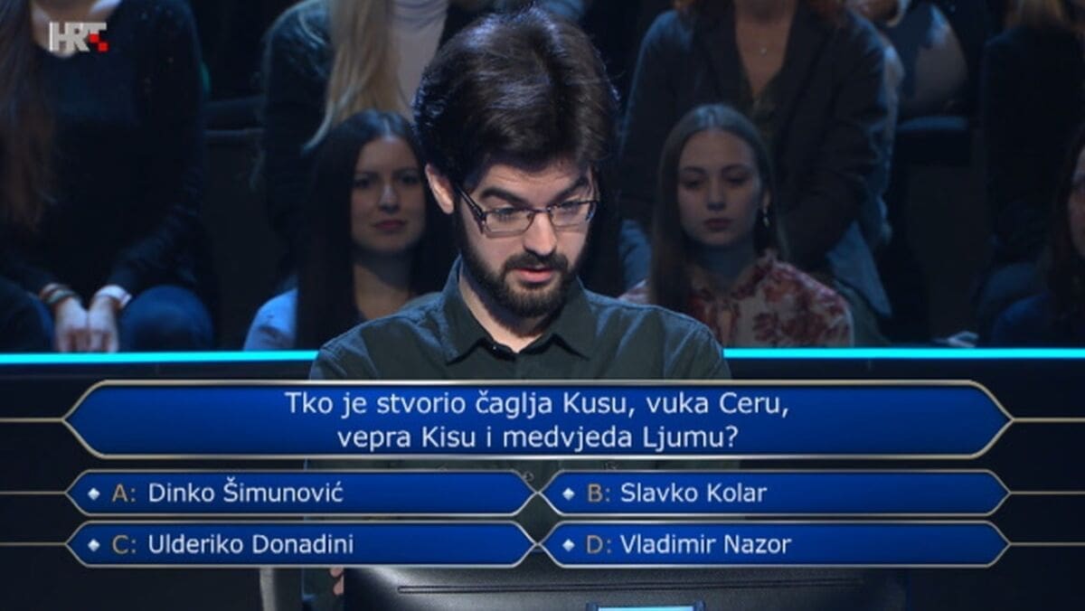 I na sljedećem, književnom pitanju logika je radila za Ivana. Za osvajanje 8000 kuna trebao je odgovoriti tko je stvorio čaglja Kusu, vuka Ceru, vepra Kisu i medvjeda Ljumu. Od književnih imena nudila su se ona Dinka Šimunovića, Slavka Kolara, Ulderika Donadinija i Vladimira Nazora.