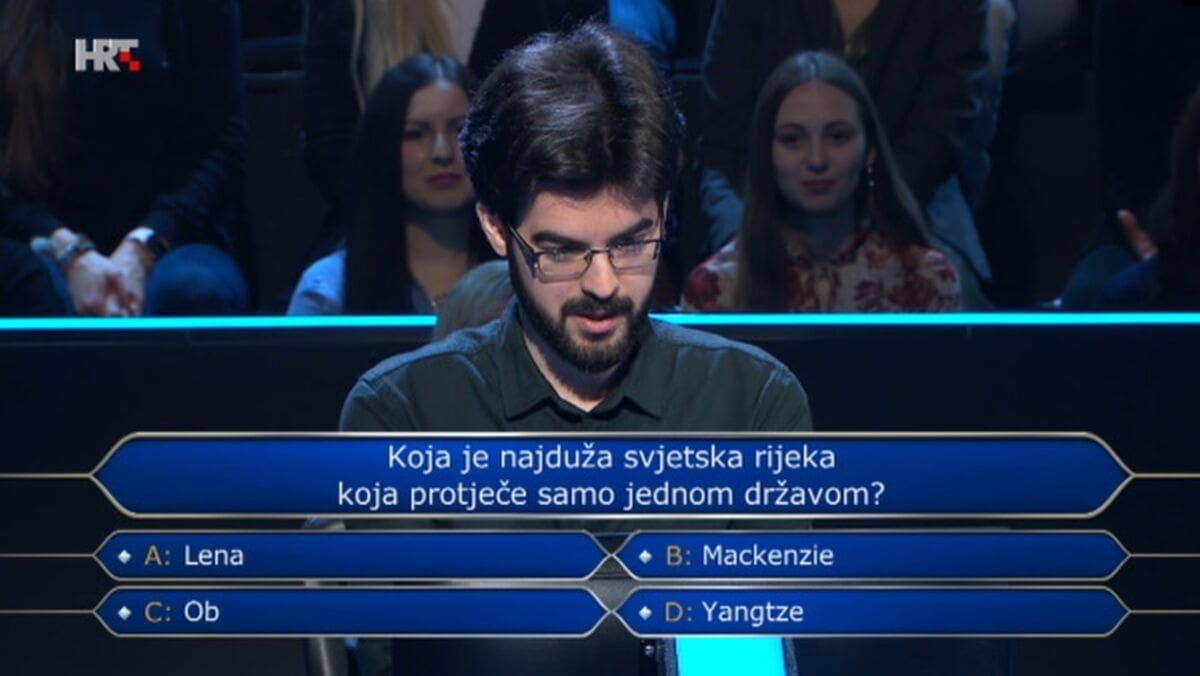 Za prelazak drugoga praga zemljopisno pitanje posebno je obradovalo natjecatelja koji je kao "iz topa" dao odgovor - najduža svjetska rijeka, ona koja protječe samo jednom državom, je Yangtze (a ne Lena, Mackenzie ili Ob).
