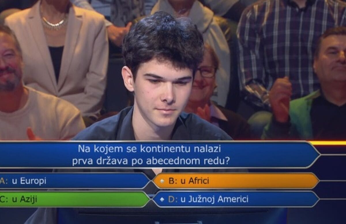 U večerašnjoj emisiji popularnog kviza "Tko želi biti milijunaš?", koji se prikazuje na HTV-u, natjecatelj iz prošlotjednoga izdanja, 18-godišnji Splićanin Stipan Šarić otvorio je 9. pitanje za 16.000 kuna. Iskoristio je džokera "zovi", svoga oca, upitavši ga nalazi li se prva država po abecednom redu u Europi, Africi, Aziji ili Južnoj Americi.