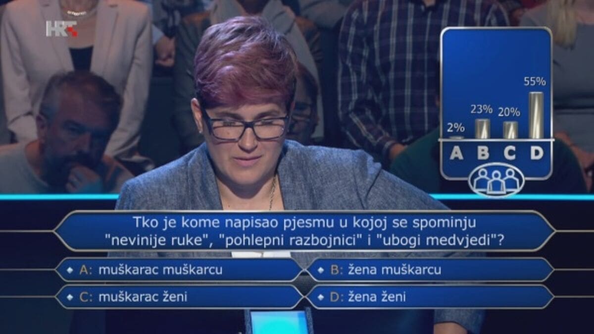 Sljedeći "najbrži prst" imala je Marijana Bišćan, rodom Splićanka s 15-godišnjim "stažem" u Tugarama. Na osmom književnom pitanju našla se na sto muka iskoristivši čak dva džokera. Nije znala tko je kome napisao pjesmu u kojoj se spominju "nevinije ruke", "pohlepni razbojnici" i "ubogi medvjedi". Ponuđeni odgovori bili su muškarac muškarcu, žena muškarcu, muškarac ženi te žena ženi.