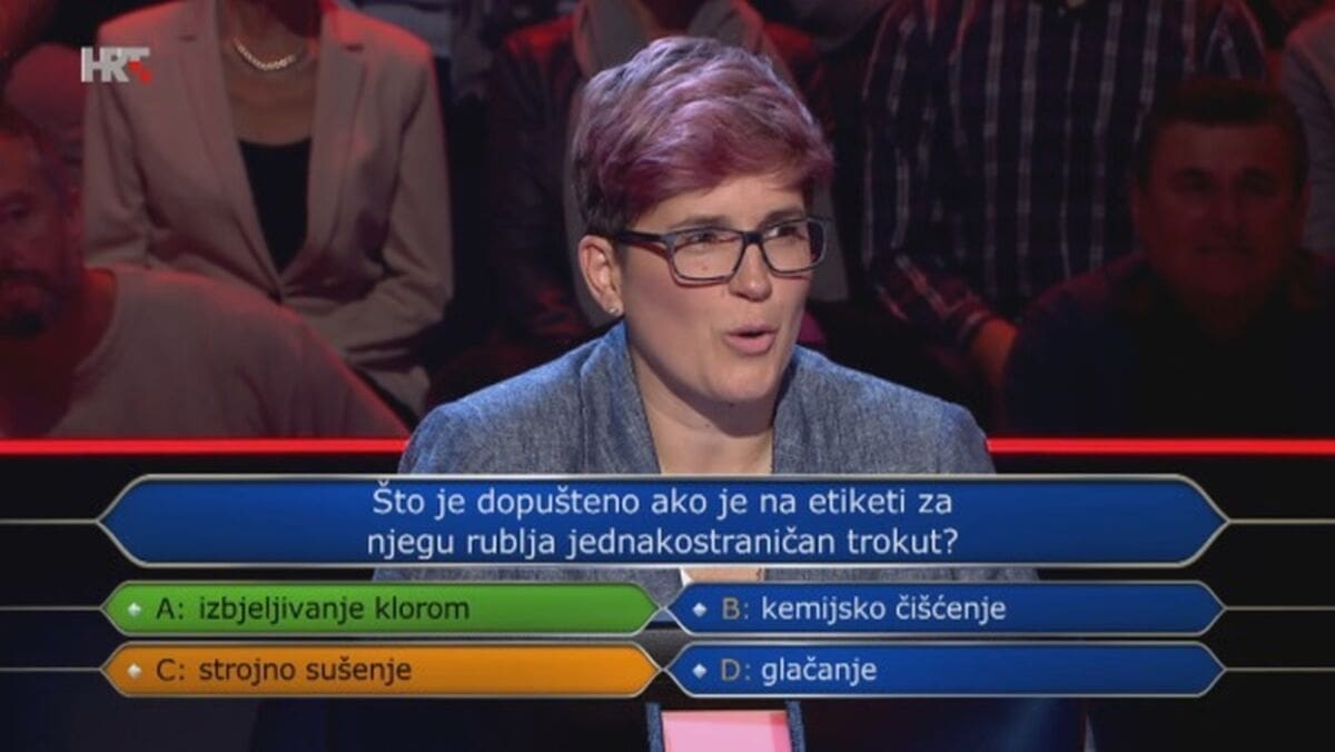 Što je dopušteno ako je na etiketi za njegu rublja jednakostraničan trokut? Izbjeljivanje klorom, kemijsko čišćenje, strojno sušenje ili pak glačanje? Iako nije znala odgovor, kockat će se, hrabro je istaknula. No zbog strojnog sušenja, njezina konačnog, ali netočnog odgovora, kviz je napustila s osvojenih 1000 kuna prepustivši mjesto posljednjem natjecatelju ovotjednoga "Milijunaša" Perici Orozu iz Vidovaca, predgrađa Požege.