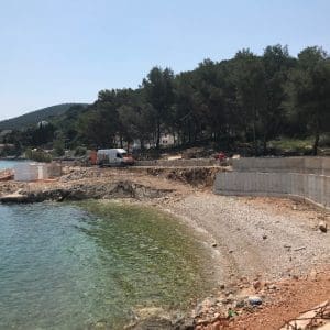 Projekt izgradnje kanalizacije se zaustavlja do daljnjeg. Pretpostavljamo da investitor EKO Kaštelanski zaljev odbija nastaviti radove kako se ne bi doveli u situaciju da odgovaraju za evidentno nelegalne radnje tik uz obuhvat projekta kanalizacije. Na naš upit da se očituju o radovima neposredno uz izgradnju kanalizacije dobivamo pismenu potvrdu da postoje nelegalni radovi koji nisu u obuhvatu projekta i da oni ne snose odgovornost za isti. No iako radovi na kanalizaciji stoje, podizvođač i dalje izvodi radove i to samo na dijelu koji okružuje budući beach bar. Dodatno, s obzirom da je plaža zbog betonskog zida smanjena, bageru ni to nije problem pa je slijedeći zahvat dodatno ravnanje stijena i proširenje plaže. Slijede daljnji radovi oko ugostiteljskog objekta te nasipavanje plaže koja se proširuje zadiranjem u more.