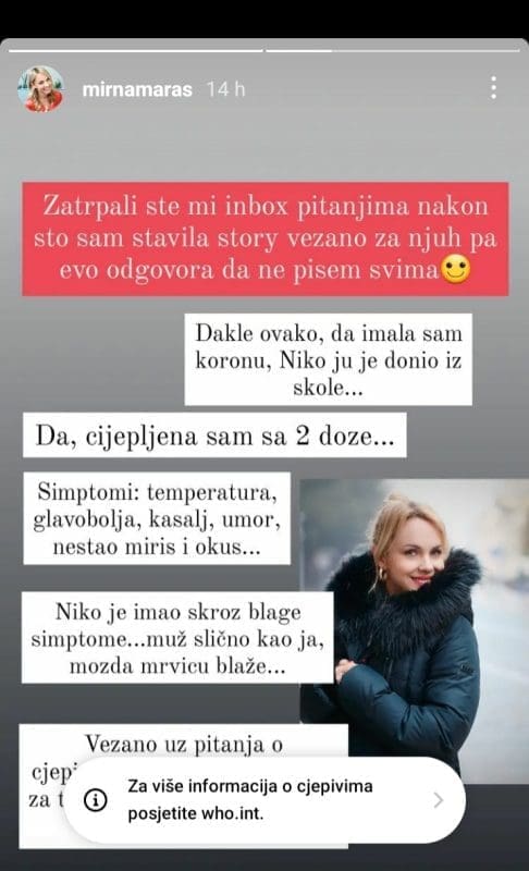 "Dakle ovako, da, imala sam koronu. Da, cijepljena sam s 2 doze. Vezano uz pitanja o cjepivu... cijepit ću se opet kad za to dođe vrijeme, tu se nema što misliti", napisala je Mirna.