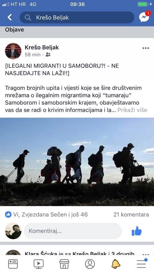 "Tragom brojnih upita i vijesti koje se šire društvenim mrežama o ilegalnim migrantima koji “tumaraju” Samoborom i samoborskim krajem, obavještavamo vas da se radi o krivim informacijama i lažima. Prava istina je da je jedna gospođa vidjela “migrante” u jednom trgovačkom centru u Samoboru te ih odmah prijavila policiji. Policija je utvrdila da se radi o stranim zaposlenicima jedne samoborske tvrtke s urednim radnim i boravišnim dozvolama. Sve ostale “vijesti” i “dojave” jednostavno nisu istinite i molimo vas sve da ne nasjedate na laži i na neodgovorno i bezrazložno širenje straha i panike", napisao je Beljak.
