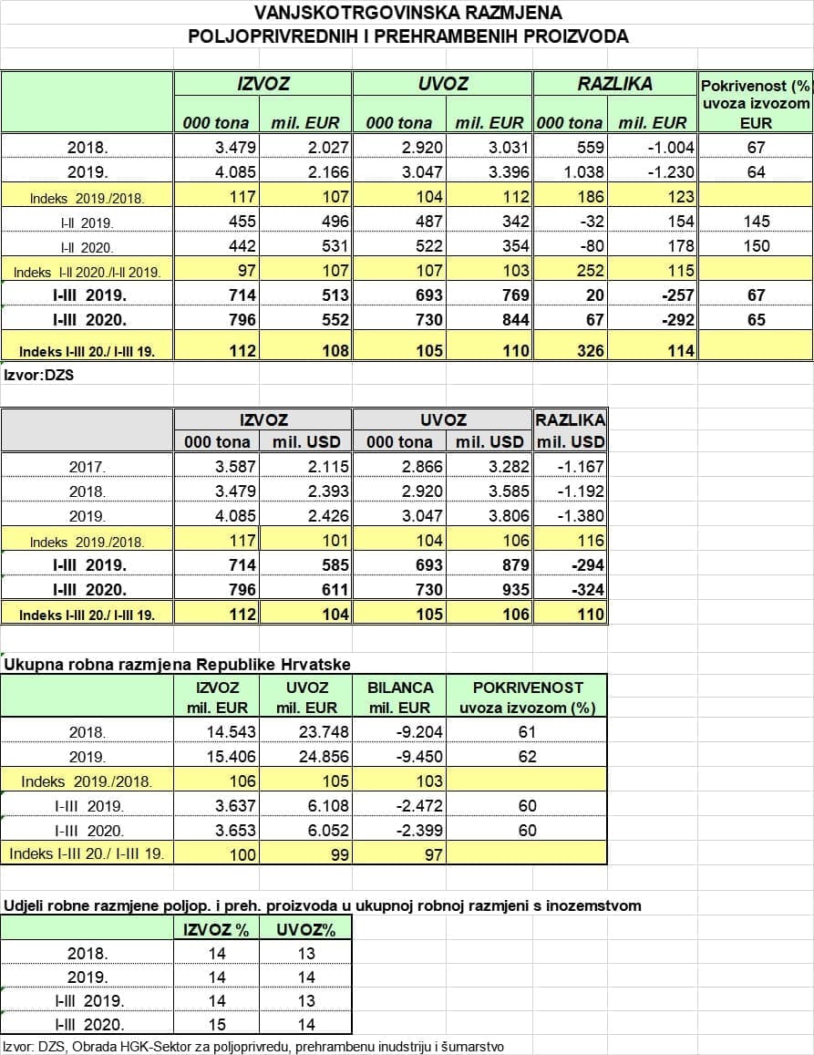 Hrvatska je u prva tri mjeseca 2020. izvezla poljoprivrednih i prehrambenih proizvoda u vrijednosti 552 milijuna eura, što je porast od 8 posto u odnosu na isto razdoblje lani (513 milijuna eura). S druge strane, u promatranom razdoblju smo zabilježili još veći rast uvoza od 10 posto (s 769 na 844 milijun eura), zbog čega nam je pokrivenost uvoza izvozom pala sa 67 na 65 posto.