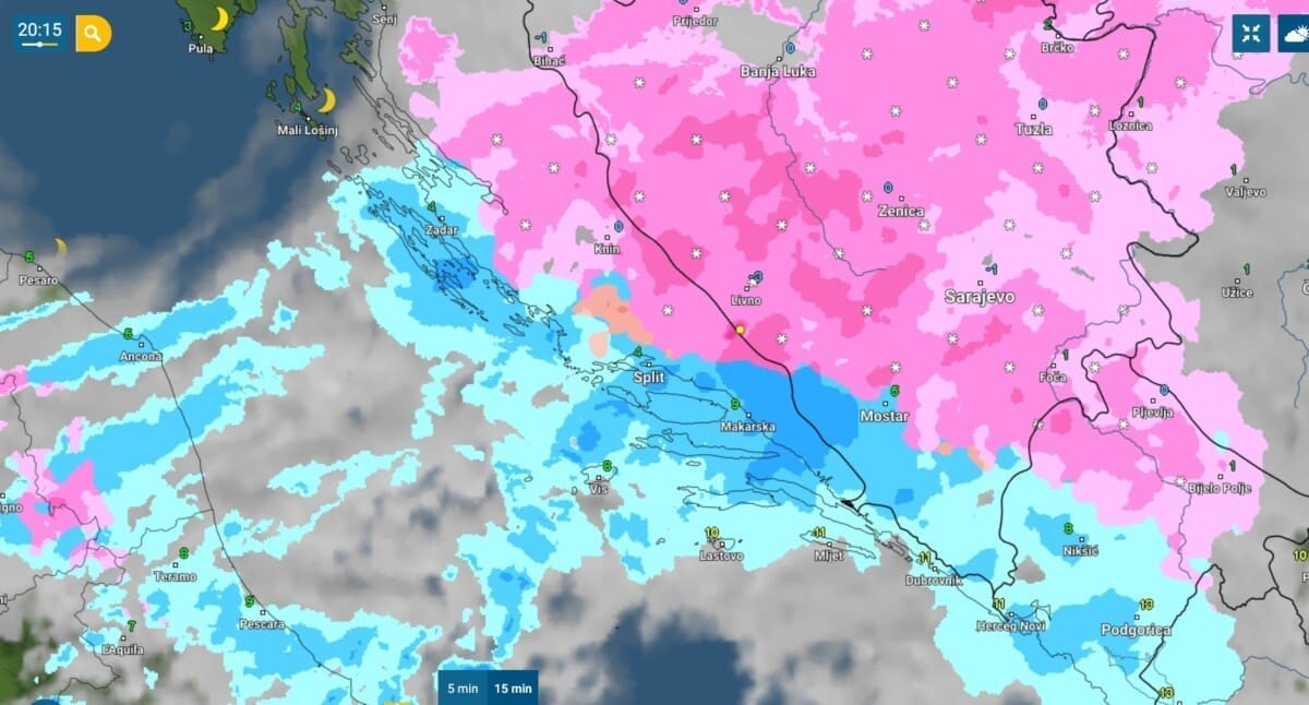 Ona daje "dobitnu" kombinaciju za snijeg - vlagu i hladnoću u svojoj pozadini. Snijeg je još jutros zahvatio unutrašnjost zemlje, zatim se zabijelio ogroman dio sjevernog Jadrana, a popodne i navečer hladnoća sve više zahvaća Dalmaciju.
