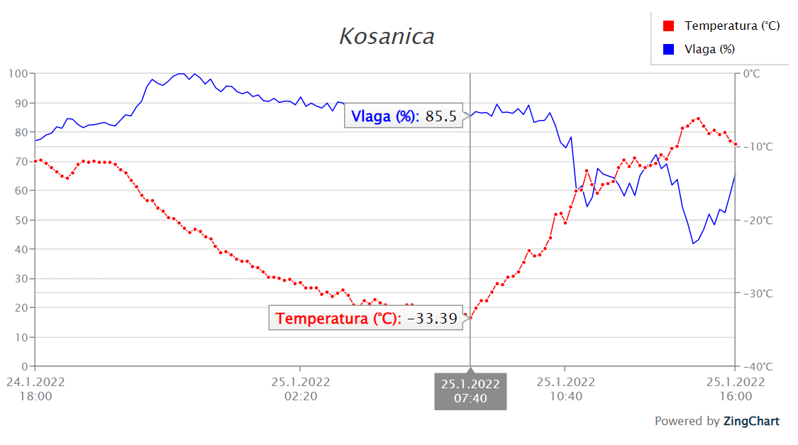 U Crnoj Gori u utorak ujutro je izmjerena rekordno niska temperatura od -33.2 stupnja Celzijusa u mjestu Kosanica u općini Pljevlja, potvrdio je "Vijestima" Dušan Pavićević, šef Meteo centra Televizije Vijesti.