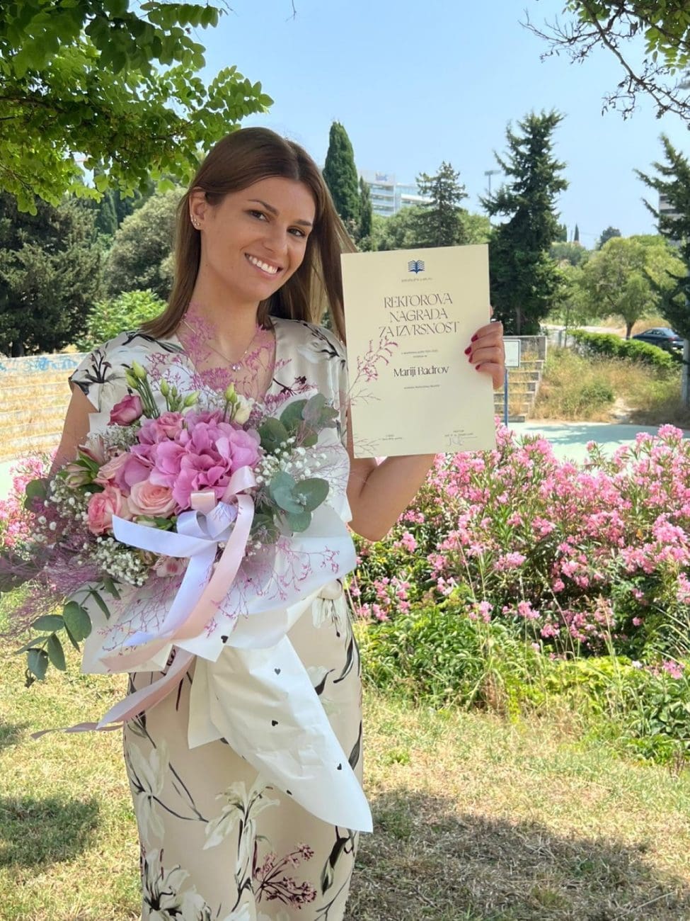 Osim što se može podičiti prosjekom ocjena na šestoj godini od 5.0, njezinu izvrsnost potvrdila je Rektorova i dvije Dekanove nagrade, te je tako ušla u krug rijetkih studenata koji su dobili toliko priznanja. Kaže da kad ostavi iza sebe puno rada i truda, nagrade dođu kao pohvala – znak da je ono što radi dobro – te otkriva da je predivan osjećaj kada vas netko pohvali. Tijekom studija bila je i članica studentske udruge PreventiST i jedna od organizatorica Kongresa studenata dentalne medicine u Splitu.