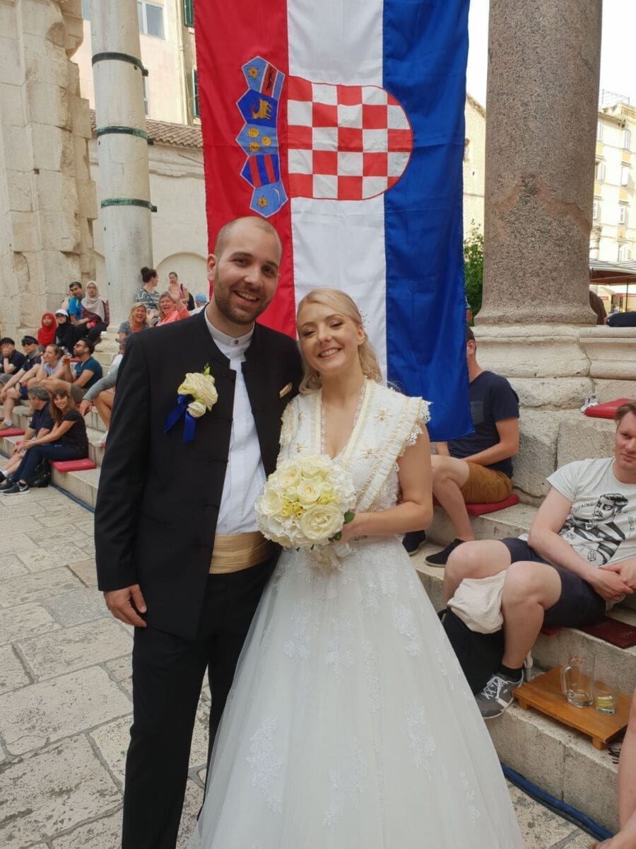 Teina majka, Slava Tomić, po zanimanju krojačica, za svoju kćer sašila je bertu, kakvu su splitske mladenke tradicionalno nosile preko vjenčanice. Mladoženja, inače praunuk igrača Hajduka Petra Borovčića Kurira, koji je igrao u postavi koja je osvojila prvi naslov prvaka za Hajduk, obukao je staro splitsko odijelo.